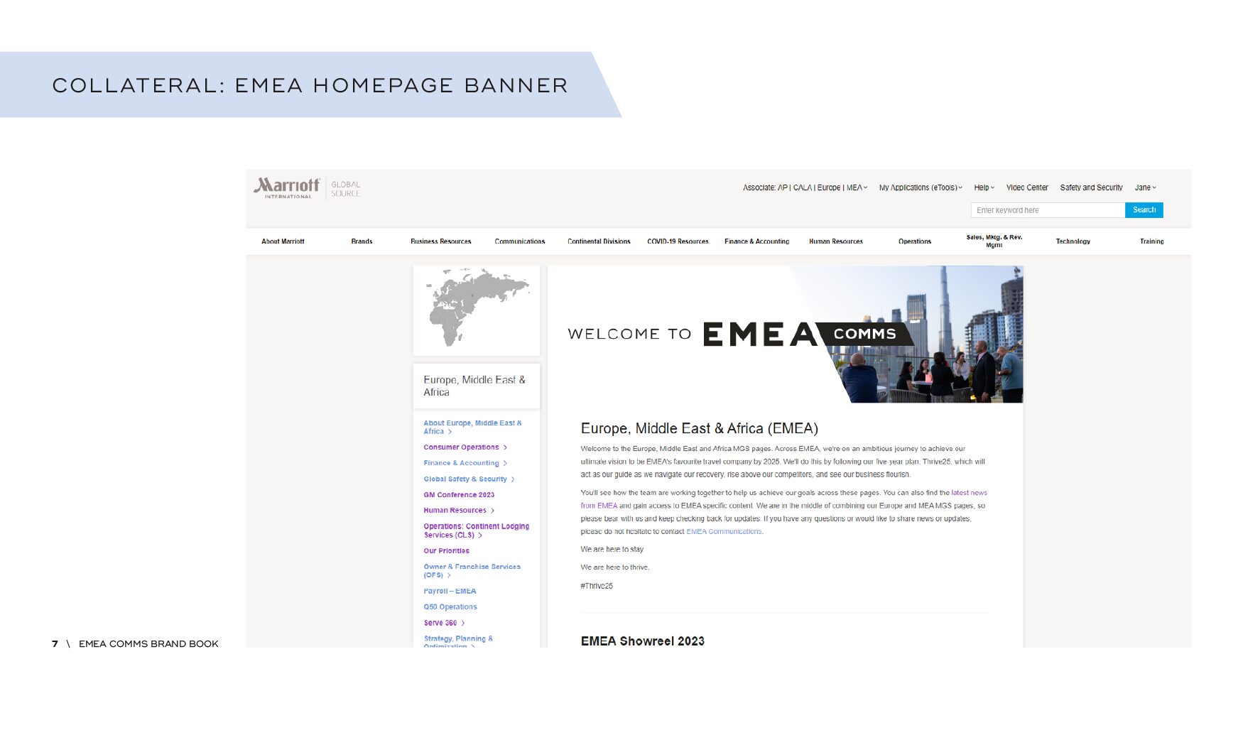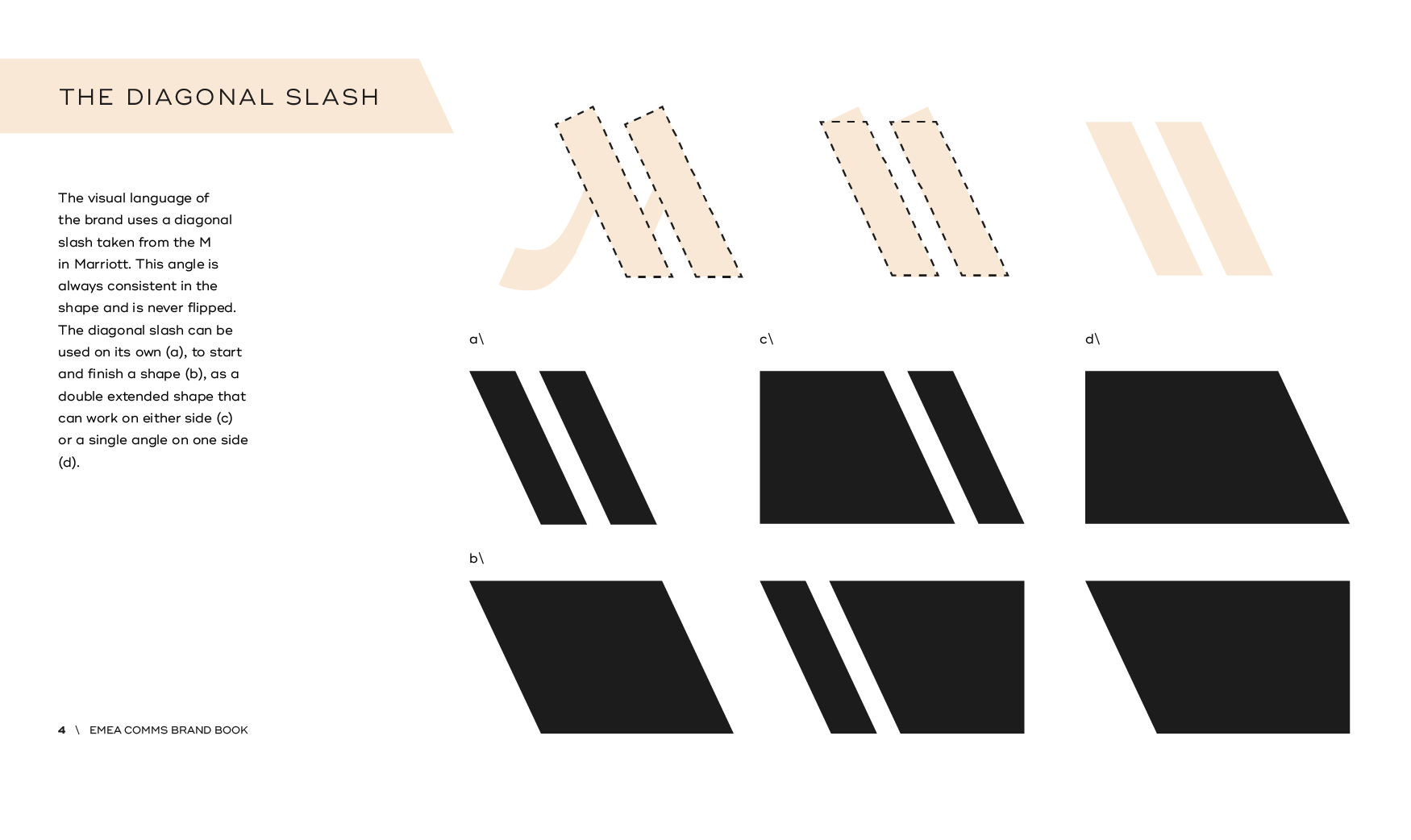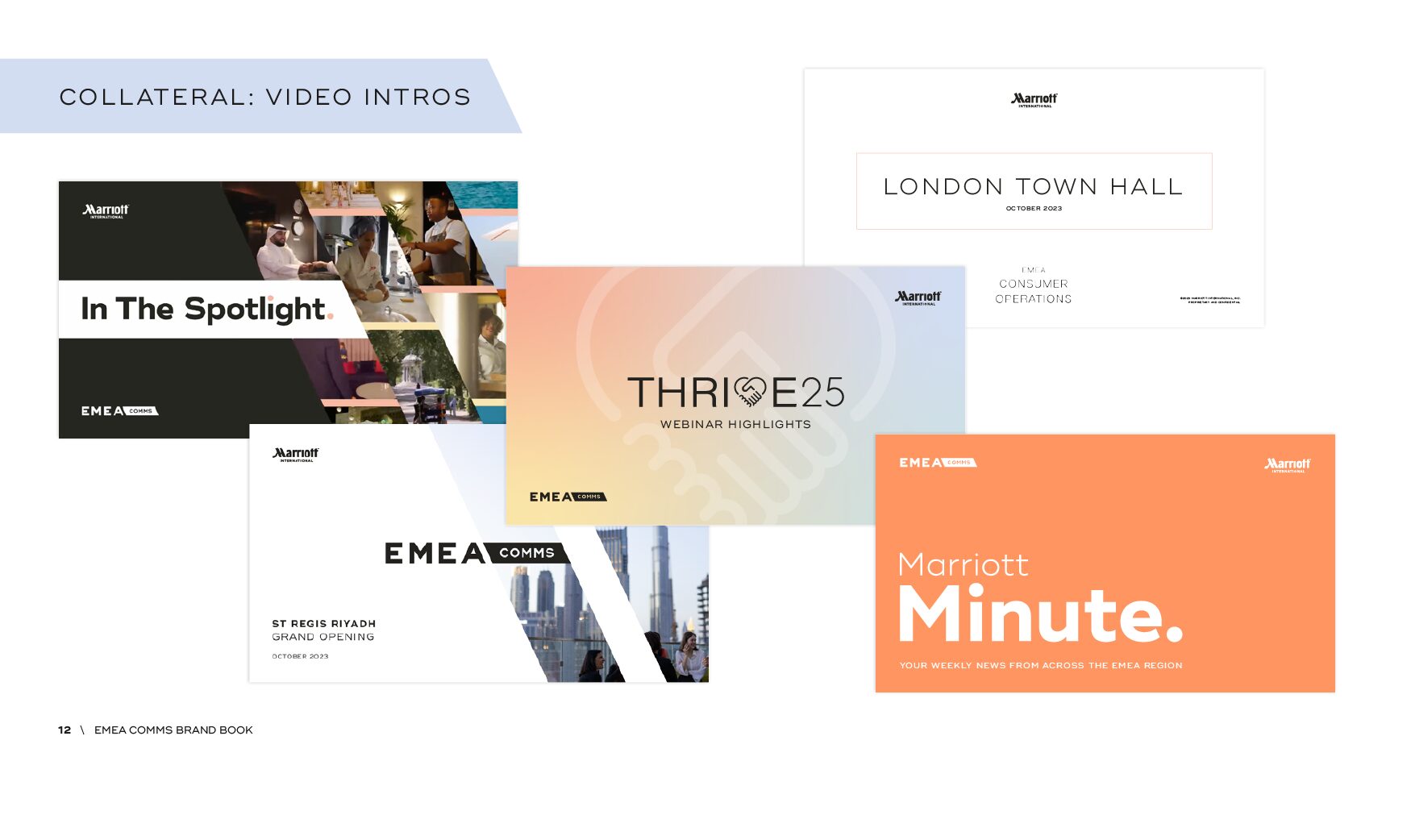 Using the corporate style, we wanted to create a standalone brand that was used for all internal communications coming from the EMEA IC team, but still making it recognisable as Marriott. We have used the angle from the Marriott font to create a slice graphic that houses elements including photography and graphics. And used the secondary colour palette to make the colours and content pop.